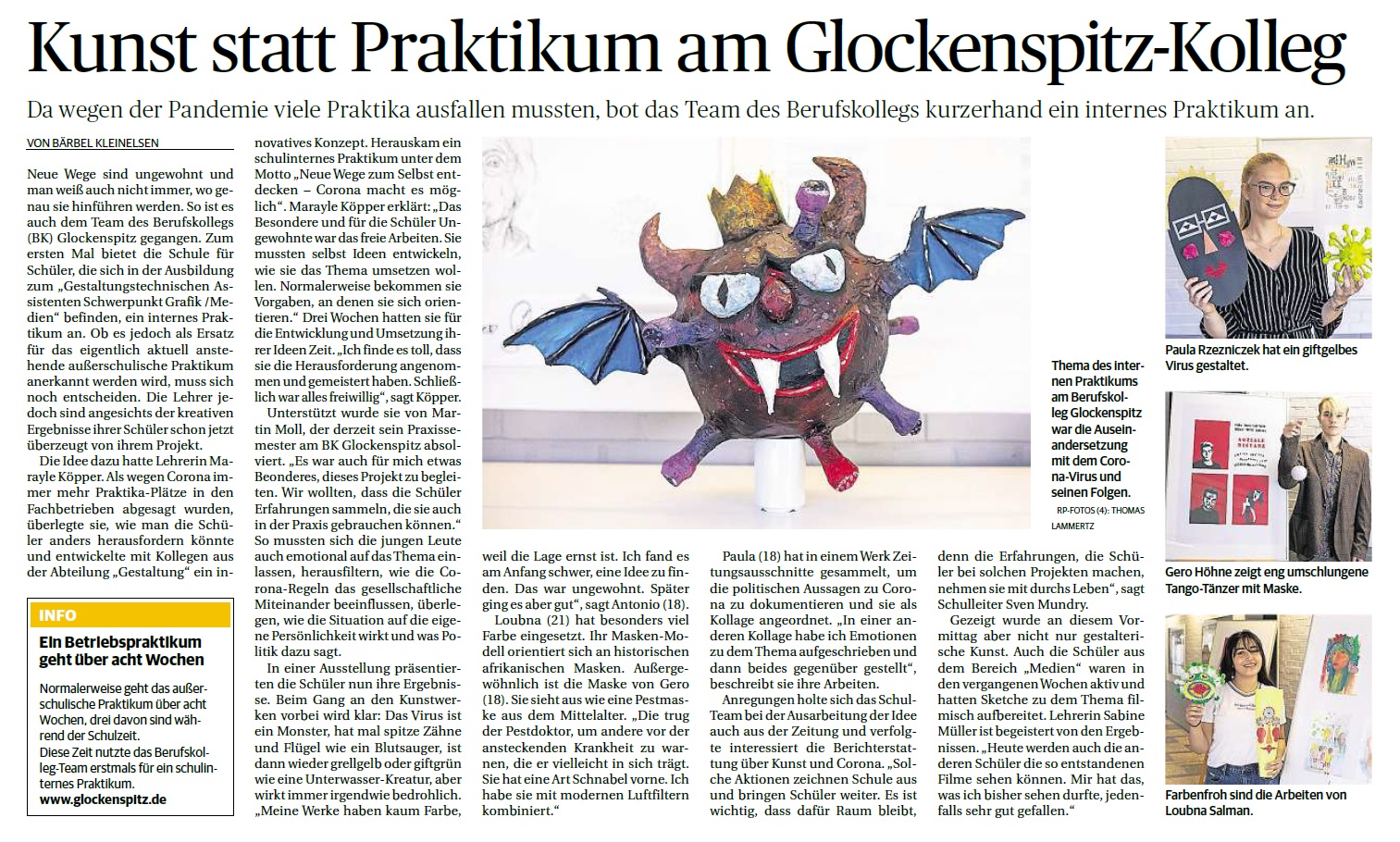 Normalerweise geht das außerschulische Praktikum über acht Wochen, drei davon sind während der Schulzeit. Normalerweise. Aber was ist in den Corona-Zeiten schon normal. So musste auch die Praktikumszeit einiger Schüler an unserem Berufskolleg neu organisiert werden, da Plätze in der freien Wirtschaft nicht zur Verfügung standen. Erstmals bot so die Schule für Schüler, die sich in der Ausbildung zum „Gestaltungstechnischen Assistenten Schwerpunkt Grafik /Medien“ befinden, ein internes Praktikum an. Die Idee dazu hatte Lehrerin Marayle Küpper. Als wegen Corona immer mehr Praktika-Plätze in den Fachbetrieben abgesagt wurden, überlegte sie, wie man die Schüler anders herausfordern könnte und entwickelte mit Kollegen aus der Abteilung „Gestaltung“ ein innovatives Konzept. Herauskam ein schulinternes Praktikum unter dem Motto „Neue Wege zum Selbst entdecken – Corona macht es möglich“. Die Rheinische Post krefeld hat am 29. Juni 2020 über das neue "Kunst-Praktikum" am Glockenspitz berichtet.